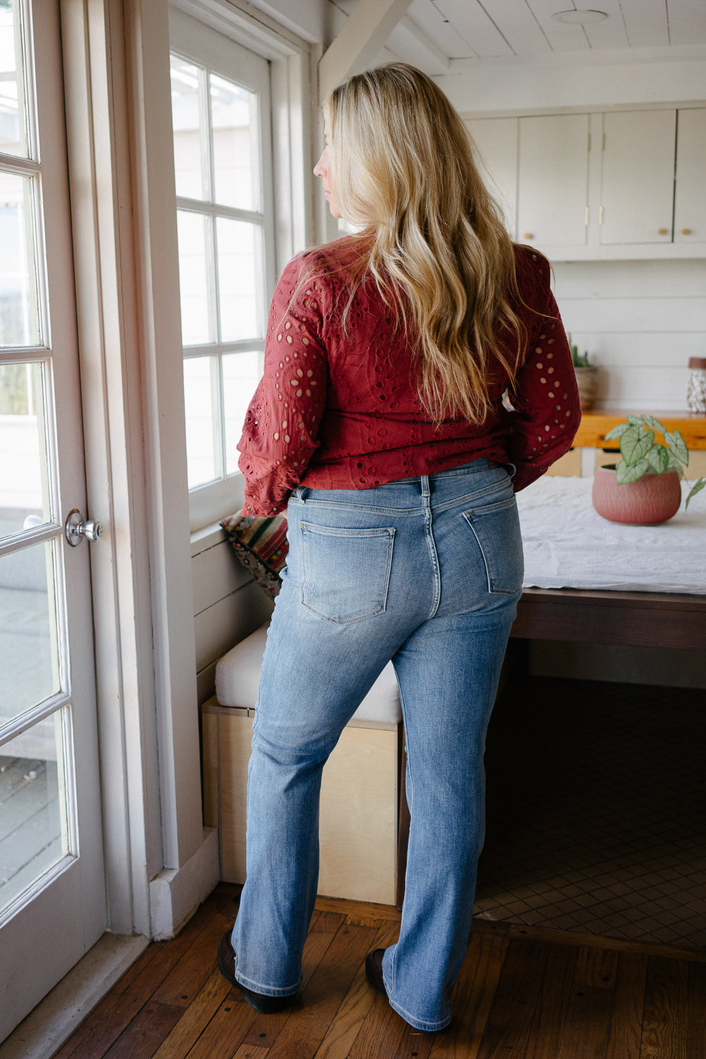 - Introducing Ashley Mid Rise Bootcut Jeans, crafted for comfort and style with a blend of 93% cotton, 6% polyester, and 1% spandex.