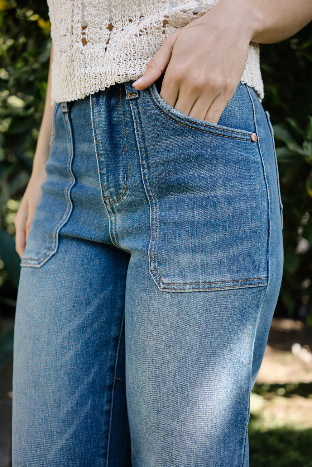 A modern take on utility style, the Georgia High Rise Utility Cropped Wide Leg jeans blend structure, comfort, and effortless versatility.