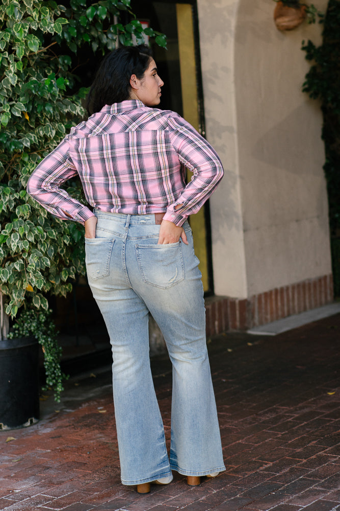 Megan Mid Rise Tinted Pin Tack Detail Flare Jeans – PLUS
